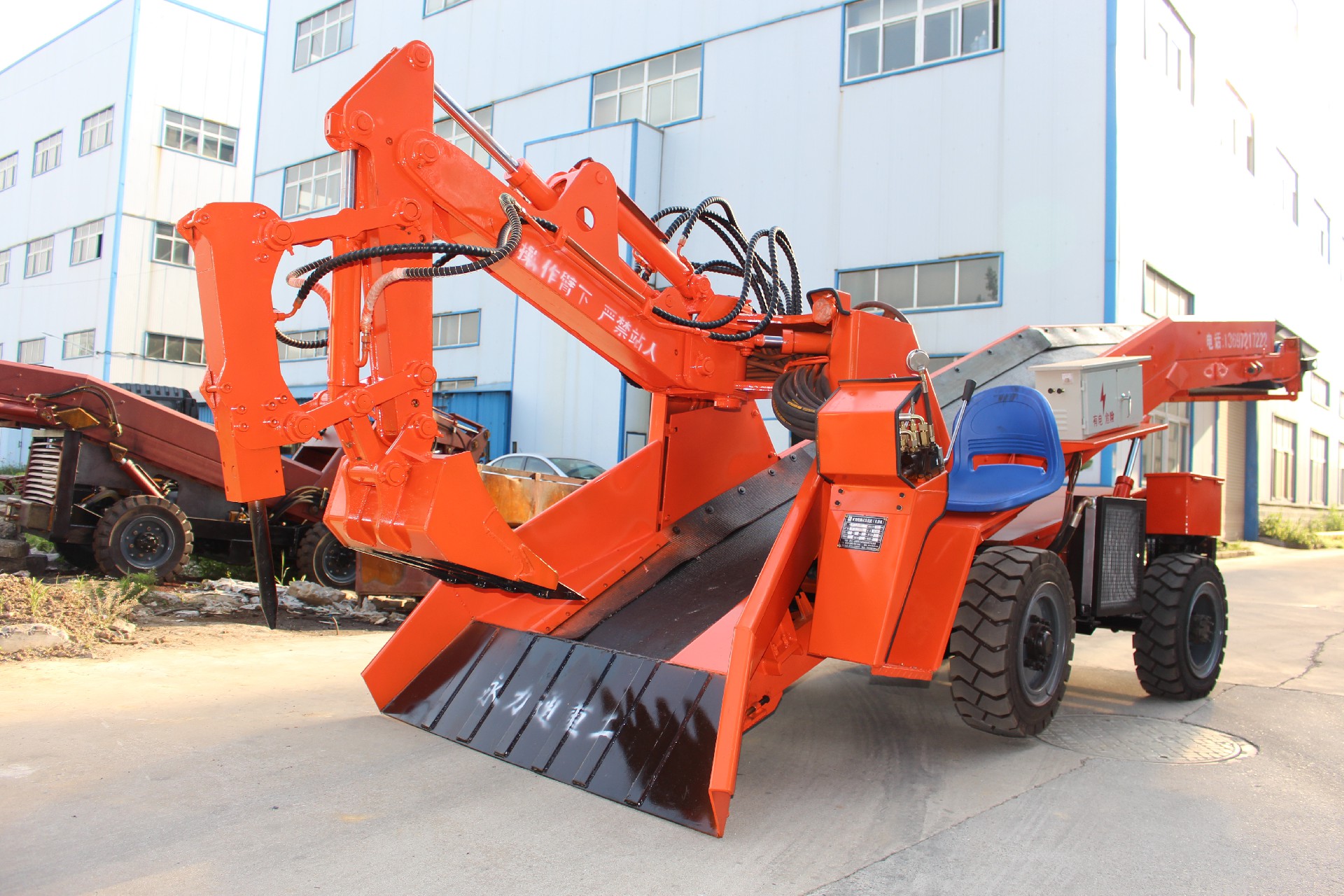 ZWY-80系列挖掘式裝載機(俗稱扒渣機、扒礦機),系輪胎式液壓馬達驅動行走,行走速度2.5千米/小時左右,其優點在于轉場速度快、靈便,能用于更換工作面。前后車橋同時驅動行走,推力大便于物料聚集,不需人工輔助清理工作面,減輕了工人的勞動強度。液壓(電動)滾筒皮帶輸送物料裝車,帶寬700mm的阻燃耐磨輸送帶,輸送速度可達0.8米/秒,輸送效率高,噪音低無污染,節能環保等特點。